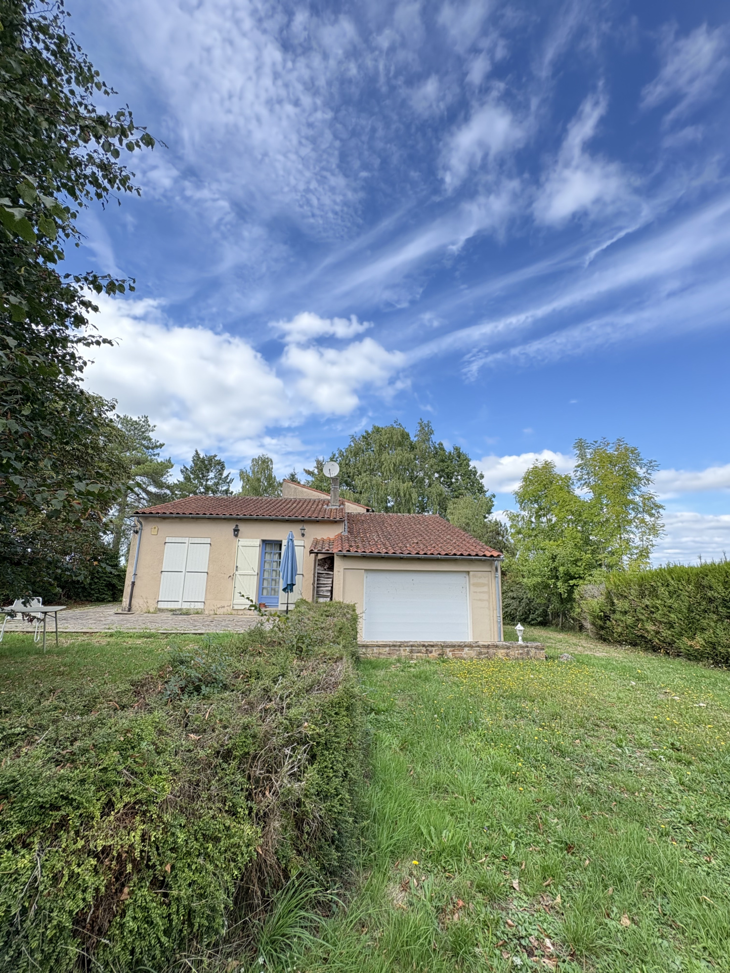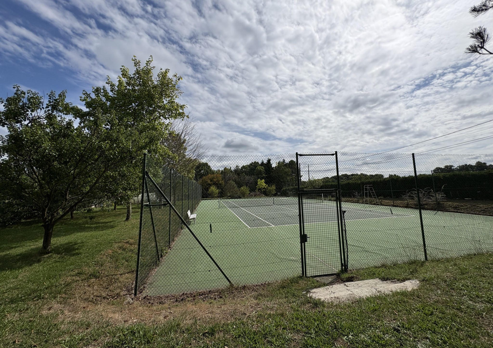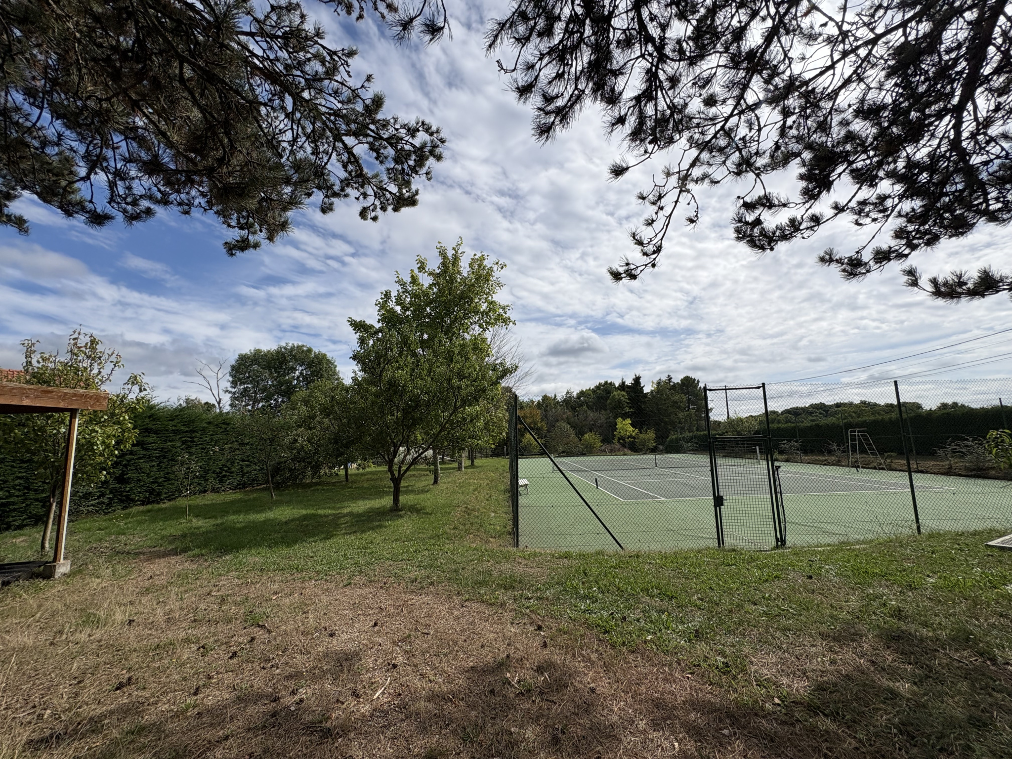 Elle est entourée d'un parc, de prairies, d'un ancien court de tennis, d'un Carport et d'une petite dépendance.