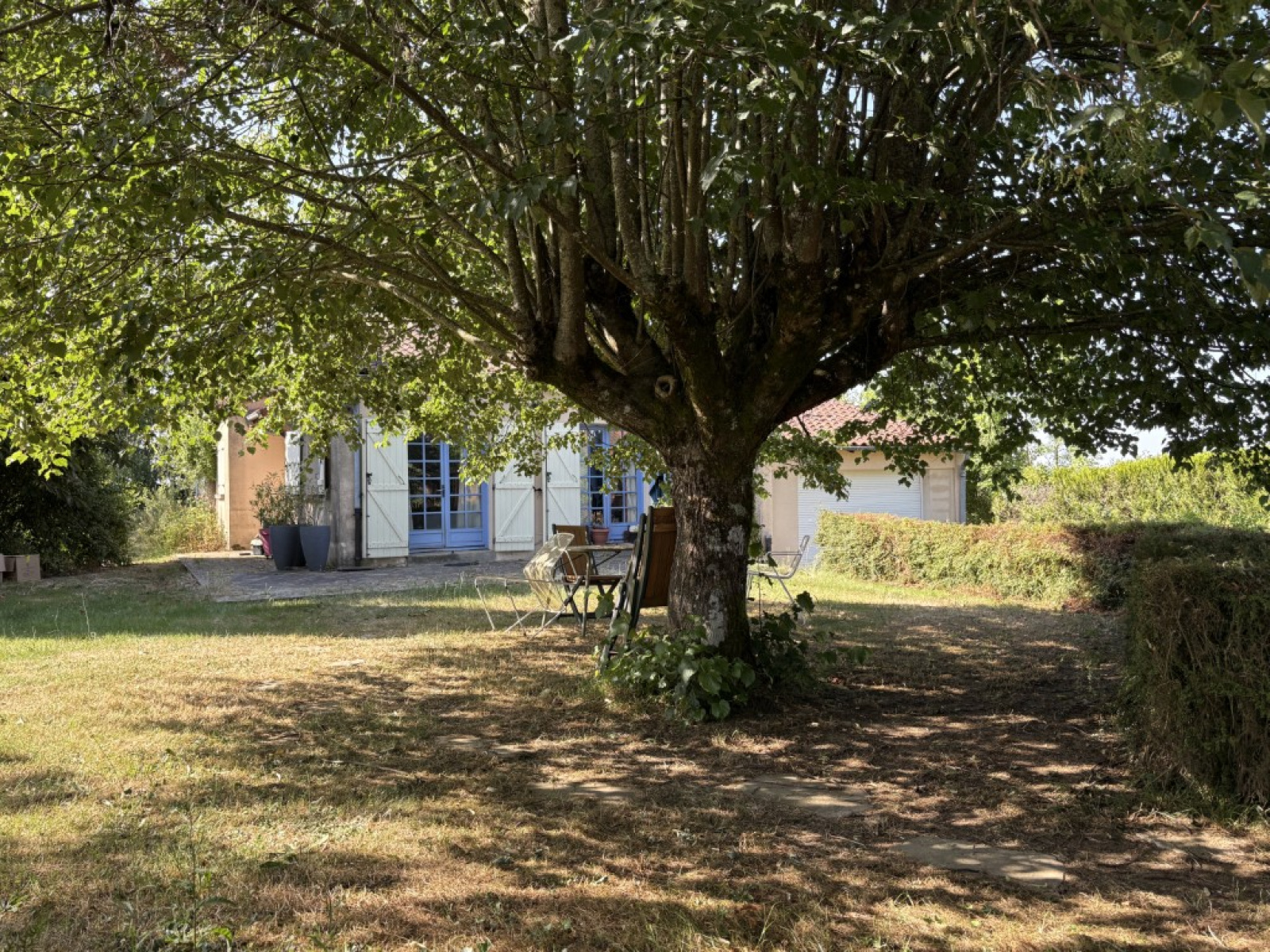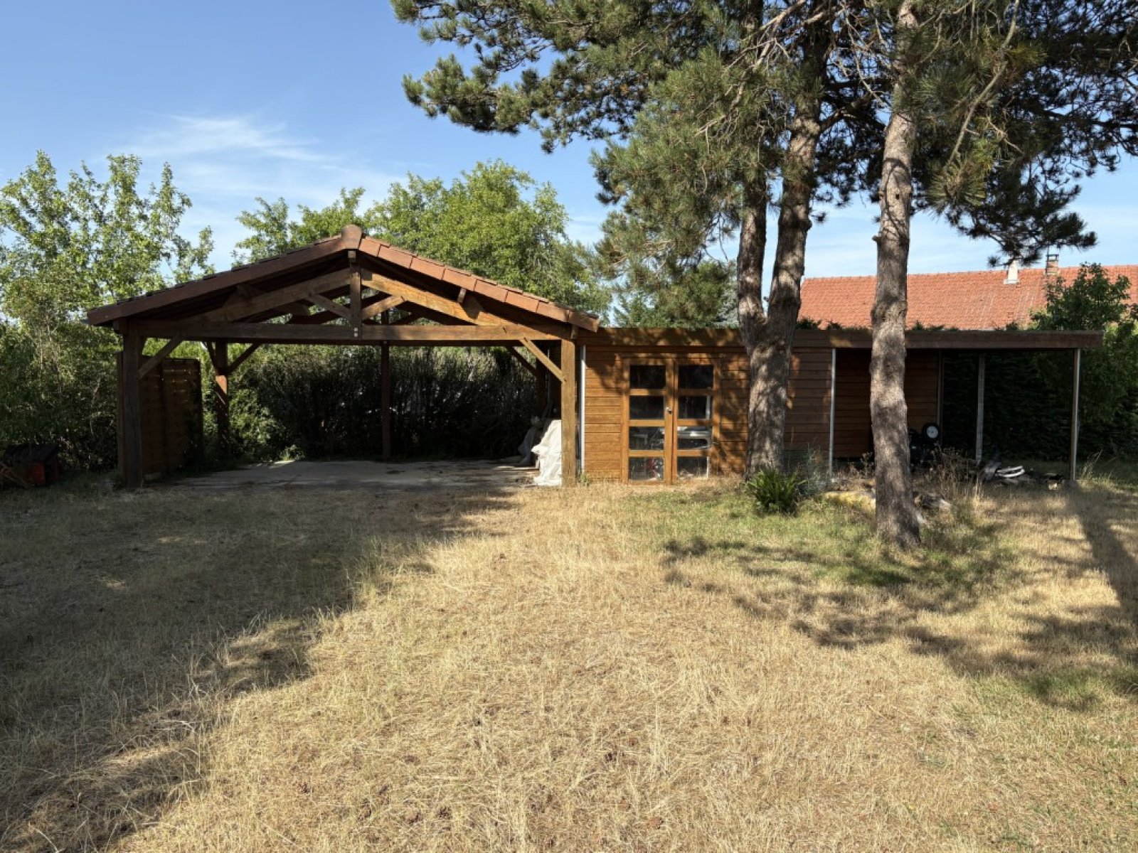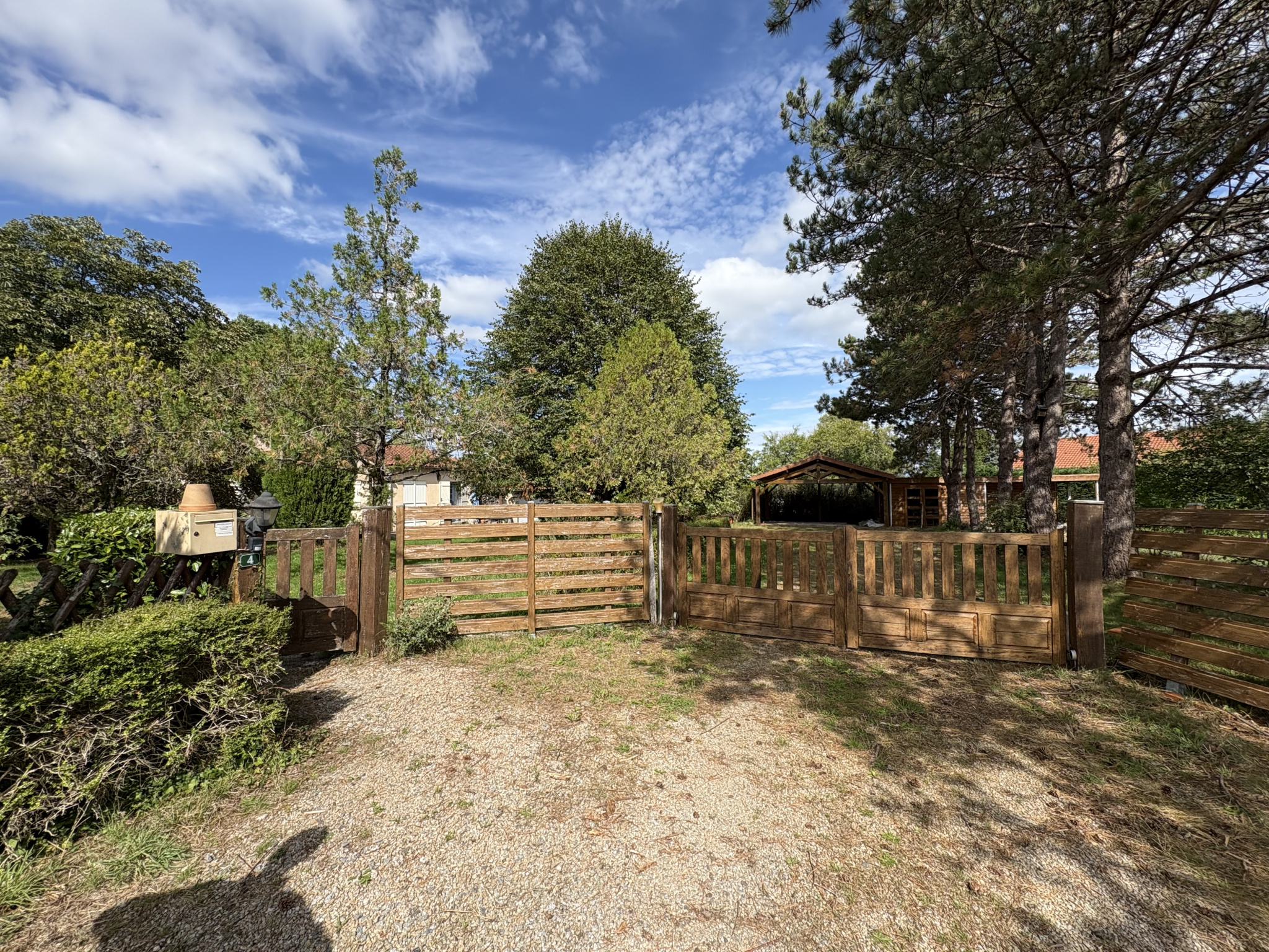 Elle est entourée d'un parc, de prairies, d'un ancien court de tennis, d'un Carport et d'une petite dépendance.